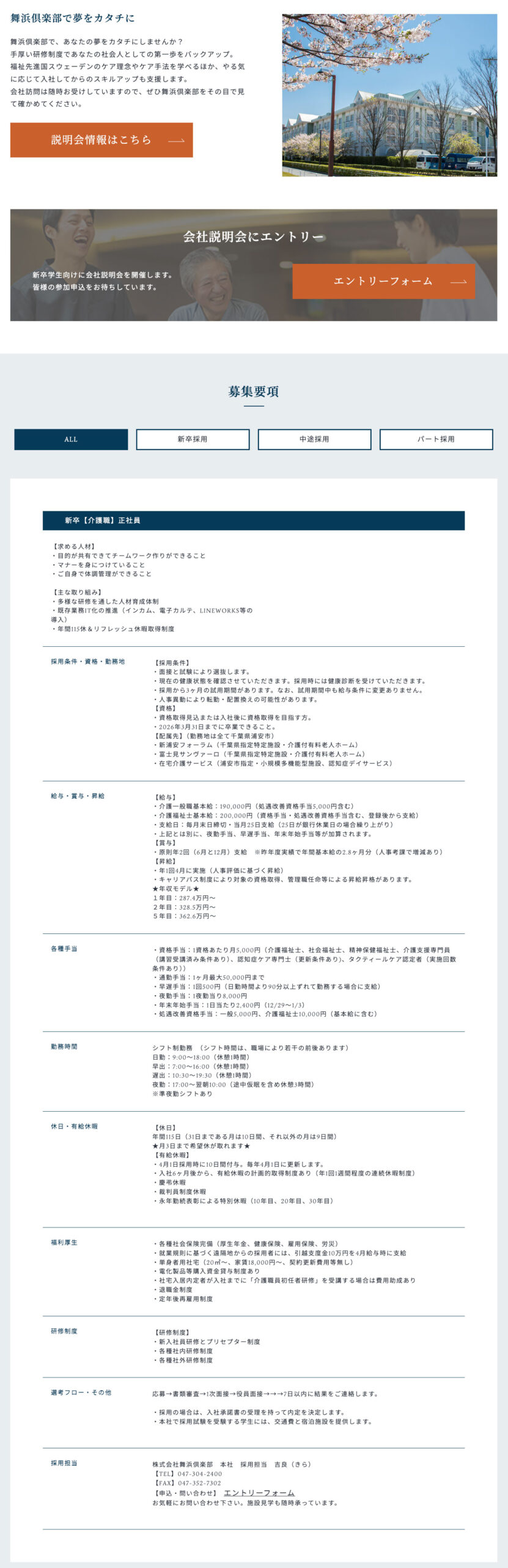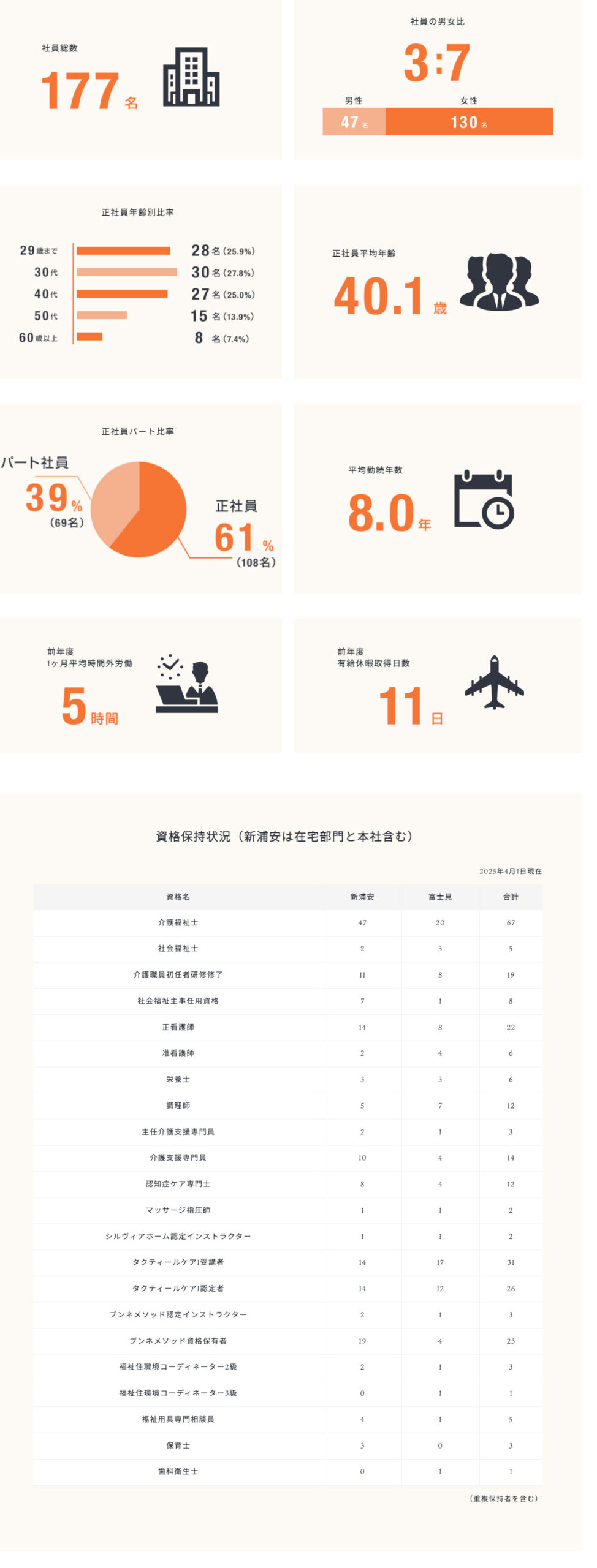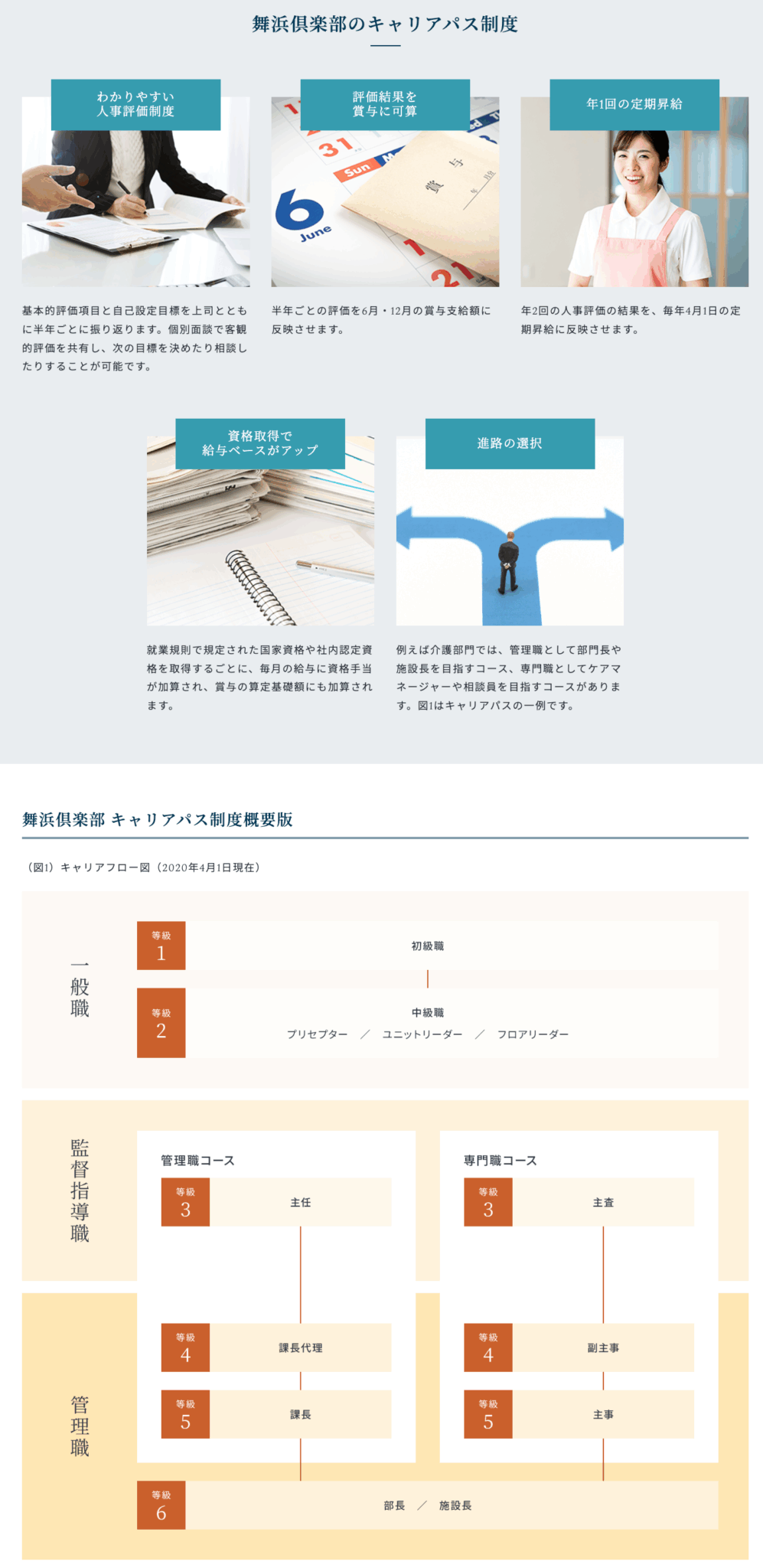 舞浜倶楽部では200⼈を超える社員たちが、連携してチームで仕事をしながら国家資格などを取得して専⾨知識を⾝につけています。管理職や専門職をはじめとする多くの仲間が、当社で一から学び、成長してきました。⼊社後は、さまざまな研修を通じて継続的に学び資格取得を⽬指すことができる環境です。