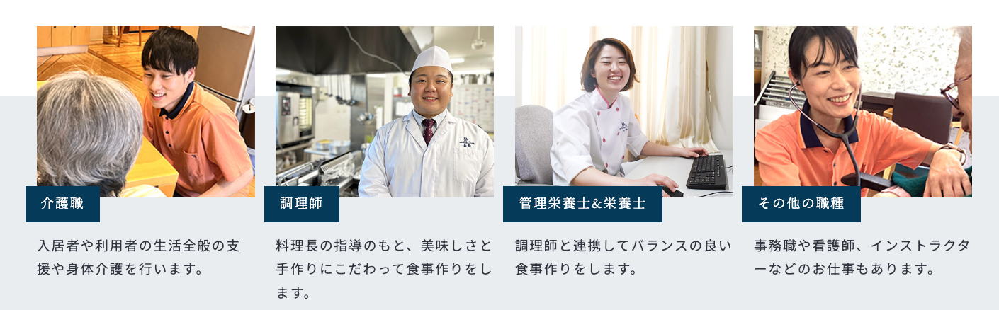 看護師、介護職、調理師、栄養⼠などすべての関係者とご家族が協力し合い、チームでケアを⾏います。。