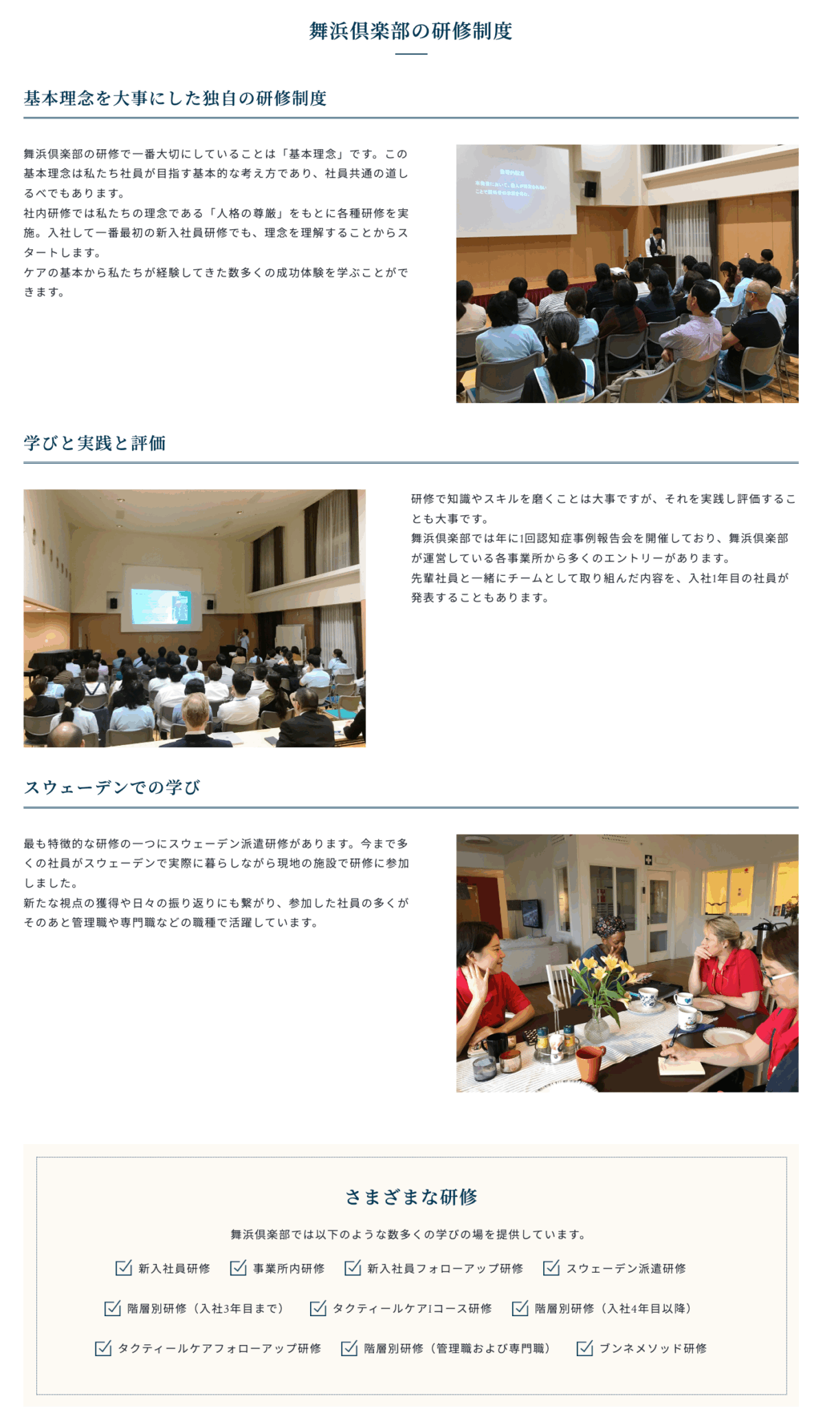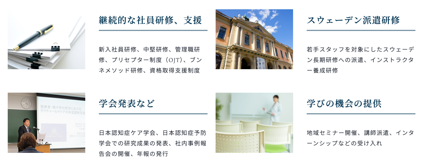 舞浜倶楽部では、社内に「スウェーデン緩和ケア研修センター」を設置し、スタッフの継続的な専⾨研修を⾏い優れた⼈材の育成に取り組んでいます。私たちは、この仕事が⾼齢者の⼈権や尊厳を守る誇り⾼い仕事であるとともに、プロとして常に学び、実践し、分かち合うことが必要であると意識しています。そして、スウェーデンのケア⼿法をはじめとする先進的ケアの実践研究を積極的に⾏い、タクティール®ケア公式認定者の育成やブンネ®メソッドの習得など、独⾃の⼈材育成に注力。今では、舞浜倶楽部の取り組みを知った若者たちが、グローバルスタンダードや先進的ケアを学びたいと、全国から集まって来てくれています。このニーズに応えるべく、社宅の増築や経済的⽀援制度を設けて若い⼈材の受け⼊れを進めています。